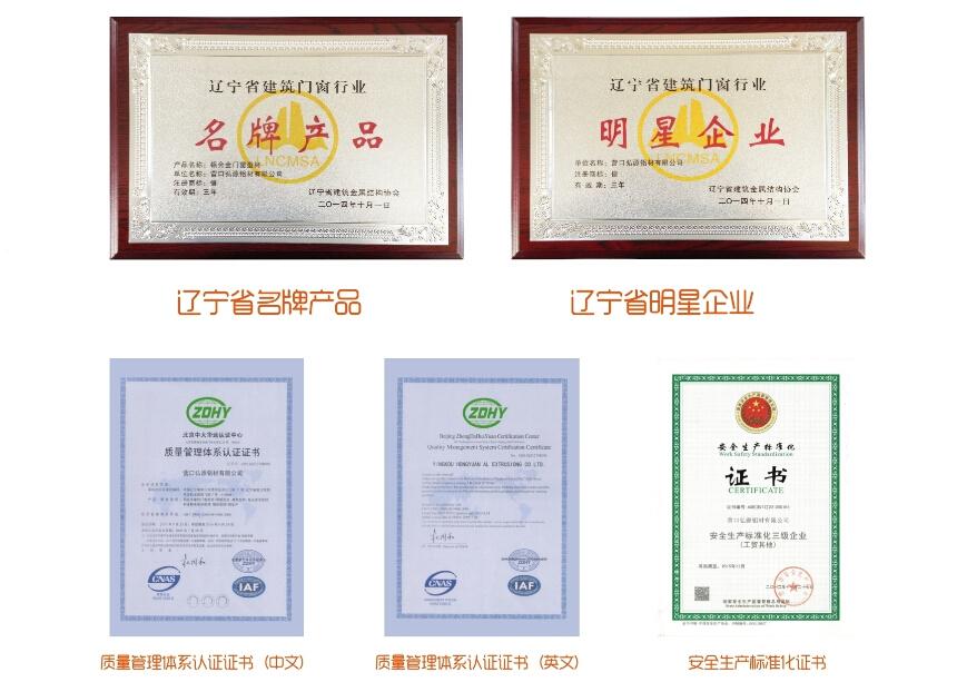 2014年,遼寧省建筑金屬結(jié)構(gòu)協(xié)會(huì)頒發(fā)遼寧省建筑門窗行業(yè)“名牌產(chǎn)品證書”、“明星企業(yè)證書”、鋁合金型材、鋁合金幕墻“定點(diǎn)生產(chǎn)企業(yè)證書”;